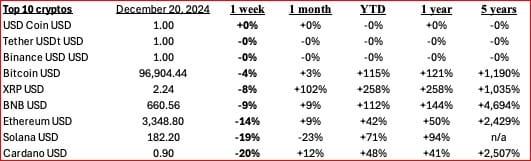 After much anticipation in the last weeks, cryptos have declined and settled within a range. Is the price spurt over for now? There was talk about the incoming administration setting a Bitcoin reserve and deregulation but it looks like investors are waiting to see what this might look like.