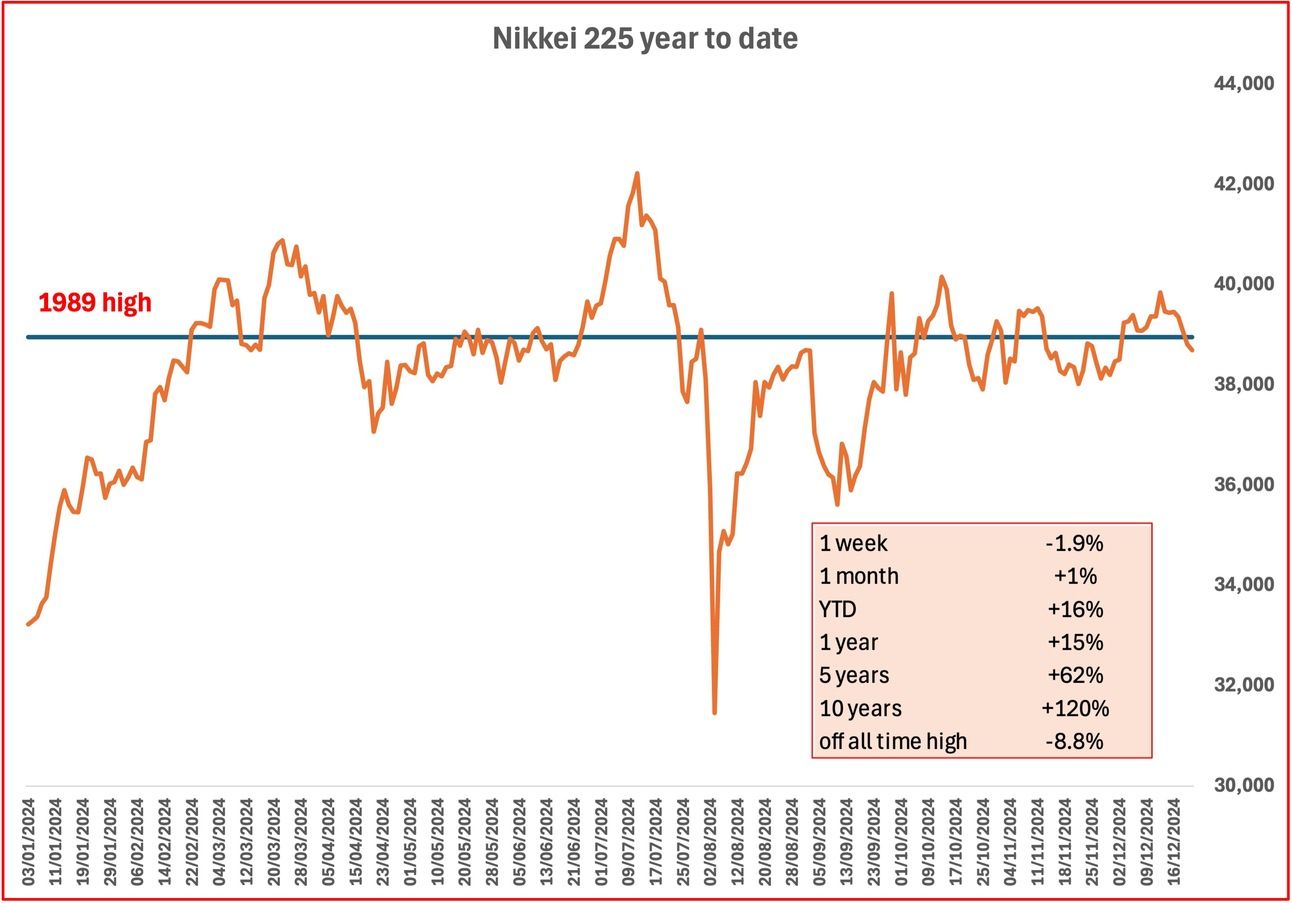 Nikkei 225 has dropped below its 1989 high, which was achieved during the bubble, as some investors question if investing in Japan should be part of their global portfolio.