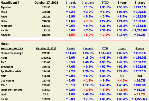Nvidia, interestingly, was flat weekly but up 36.4% YTD, reflecting some consolidation after rapid gains this year.