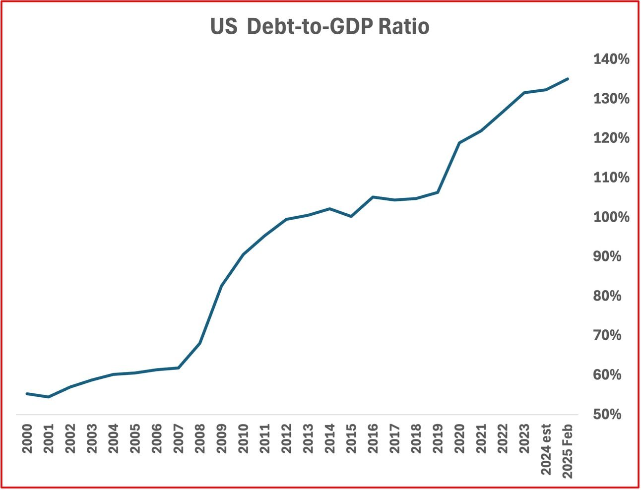 A good way to look at debt is to compare it to GDP to get an idea of proportionality. The chart below shows the history of debt as a percentage of GDP growing from 60% of GDP in 2000, to 135% currently.
