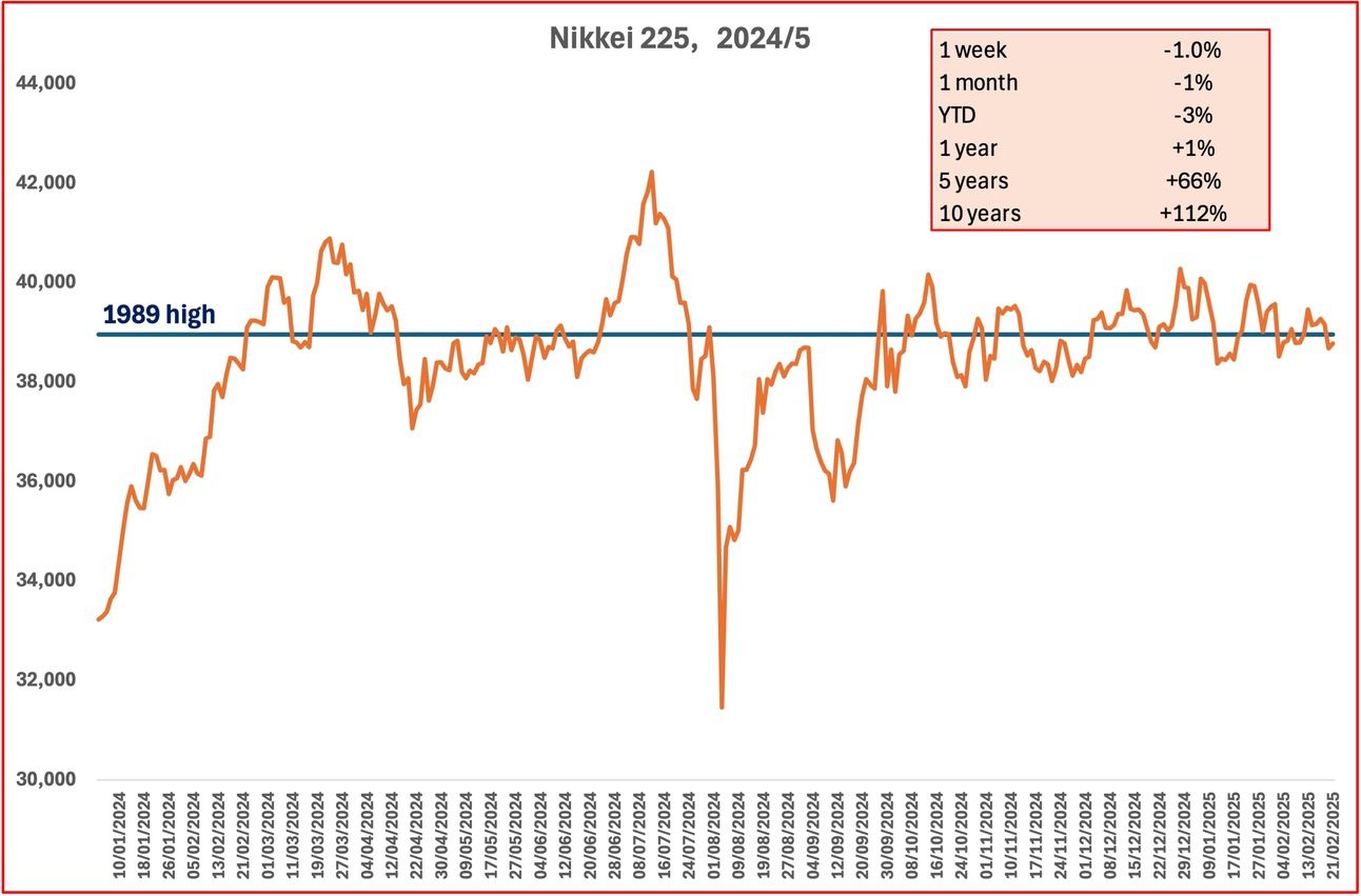 Nikkei 225 converges to its 1989 high, dropping 1% in the week. Reason? US tariffs!