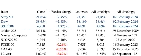 India’s Nifty 50 was the best performer this week, reaching all time highs, after the government’s interim budget plans a cut in borrowings in 2025.