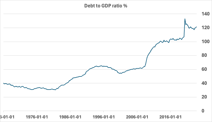 Relative to the size of the economy(GDP), debt is now at 123%.