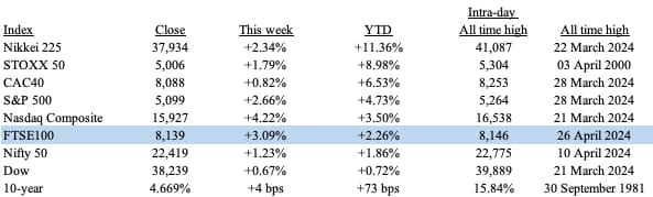 Meta’s share price fell nearly 10% as investors got nervous as Meta announced significant expenses on AI, which may not generate revenues quickly enough. The release of Llama 3 last week was well received.