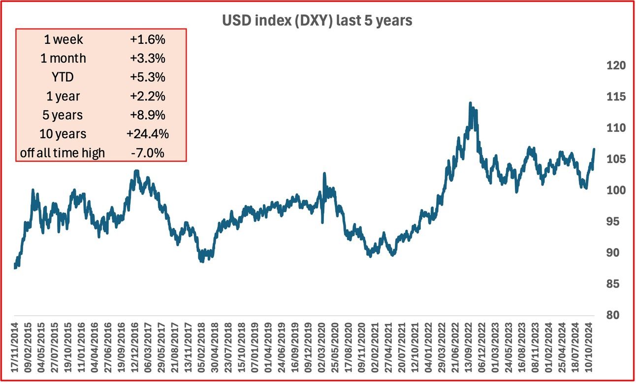 The USD index has gained over the last two weeks due to the election results. Also the Federal Reserve may delay interest rate cuts due to the inflation outlook. Higher interest rates support the dollar.