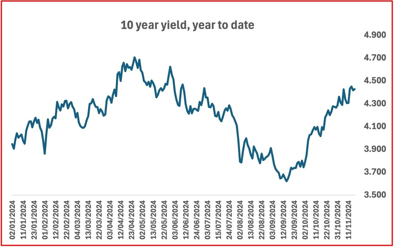 10 year yield increased in the week. It is now at the highest level since June. Chair Powell of the Federal Reserve indicated that inflation is showing signs of persistence, but getting closer to 2%. He said “The economy is not sending any signals that we need to be in a hurry to lower rates”. This could mean that the Fed will not cut in December.