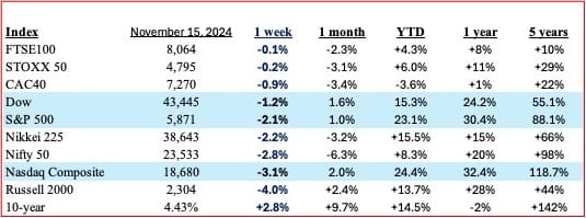 The momentum from last week continued till Monday, with the S&P500, Dow, and Nasdaq setting new records this week before falling back. The post-election gains have been partly given up as markets await further indications on how the incoming administration will govern.